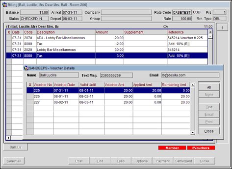 To check guest eligibility for vouchers and to print vouchers, select Miscellaneous > Electronic Vouchers. The E-Vouchers Print screen displays. This screen displays all the reservations that have any unused vouchers associated with them. Reservation records can be selected for either a text message, e-mail, or printing.